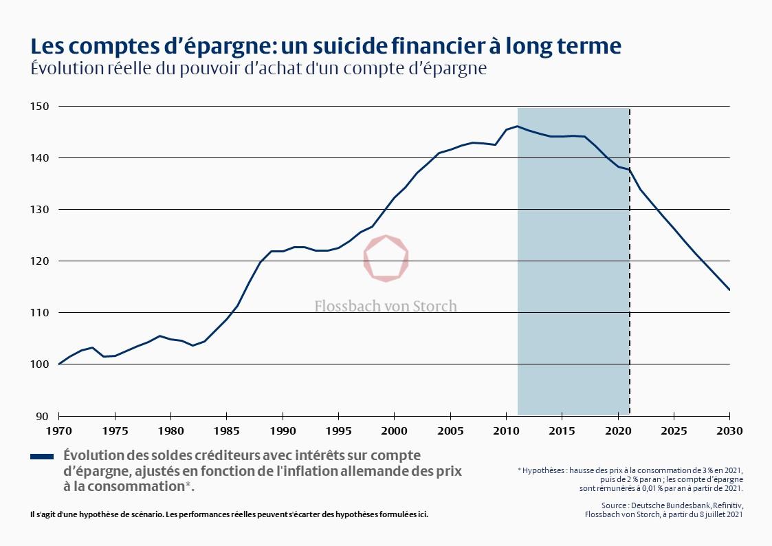 Ceux qui placent leur argent dans des obligations d'État sûres en paient également le prix. Autrefois, il était possible de calculer combien d'argent il fallait mettre de côté pour pouvoir vivre avec des revenus d'intérêts sûrs, mais aujourd'hui ce calcul est superflu en raison du manque d'intérêts. Face à une perte certaine, on peut tout au plus encore calculer à quel point et à quelle vitesse le pouvoir d'achat d'un actif investi en valeurs nominales se réduit (cf. graphique 1). Mais au lieu de faire face à la réalité, de nombreux investisseurs rêvent du retour du bon vieux temps. La hausse de l'inflation les fait peut-être sortir de leur léthargie.